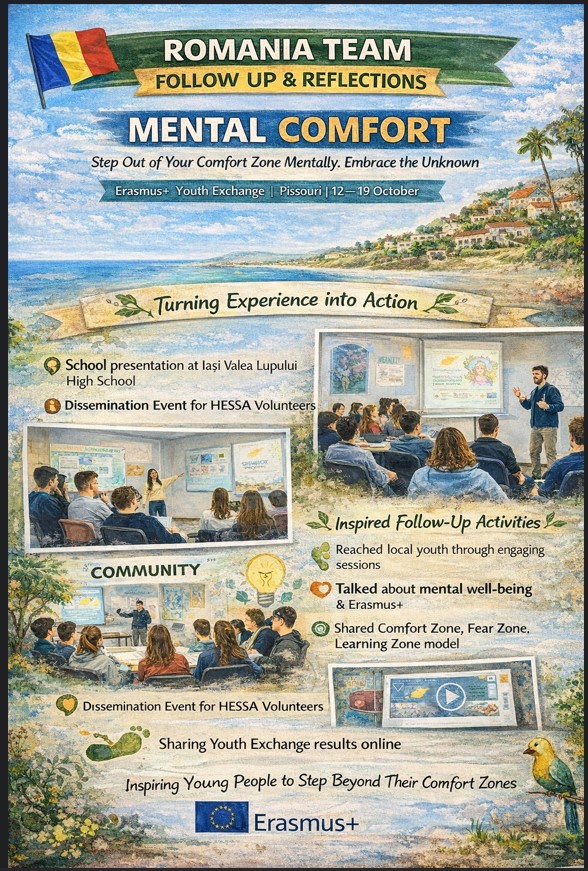 After returning from the Youth Exchange "Step Out of Your Comfort Zone Mentally: Embrace the Unknown" (MENTAL COMFORT), which took place in Pissouri, Cyprus from 12 to 19 October, the Romanian participants and group leaders continued the impact of the project through a series of local dissemination and follow-up activities organized with the support of the organization HESSA Association from Iași.
