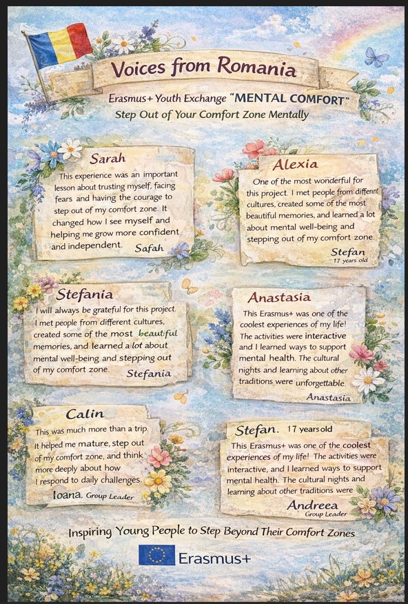 The Romanian participants shared their personal reflections about their experience during the MENTAL COMFORT Youth Exchange, highlighting the impact the project had on their personal development, confidence, and understanding of mental wellbeing.
