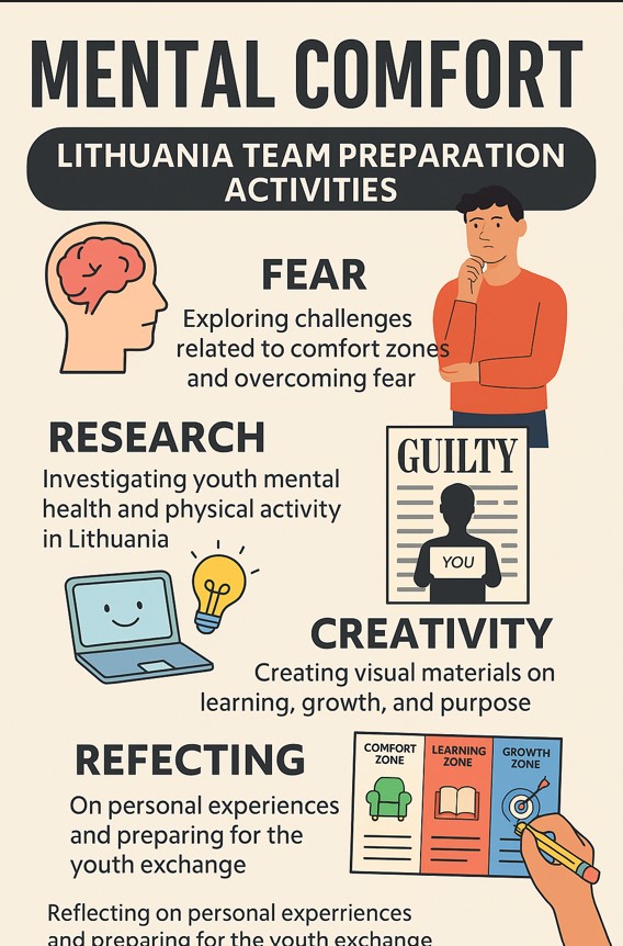 Before the MENTAL COMFORT youth exchange, the Lithuanian team carried out a series of preparation activities focused on understanding the link between mental health, physical activity, and stepping out of one's comfort zone. Through discussions, research, and creative poster-making, they explored the main challenges young people in Lithuania face regarding stress, anxiety, and self-confidence, while highlighting national initiatives that promote well-being through movement and community engagement. These activities helped participants reflect on their own comfort zones and prepare for active involvement in the project.